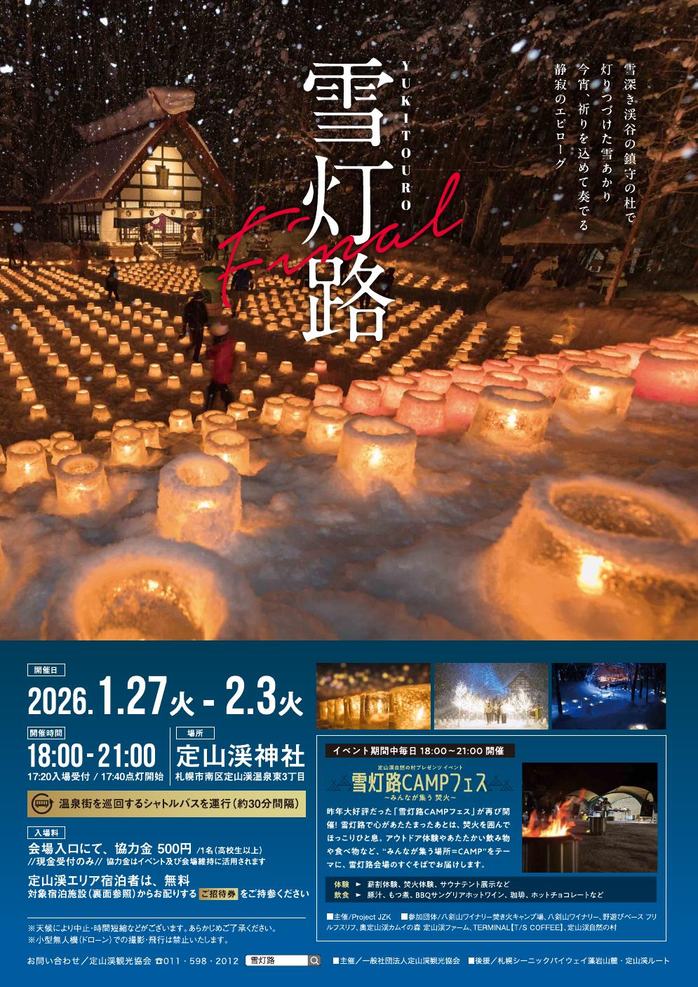 無数のスノーキャンドルが神社の境内に灯る幻想的なイベント。札幌市内中心部からはバスで約1時間。日帰り温泉と楽しむのがおすすめ。2026年、現在の形式である“スノーキャンドルの雪灯路”はいったん終了。来期より新しい形に生まれ変わる予定。